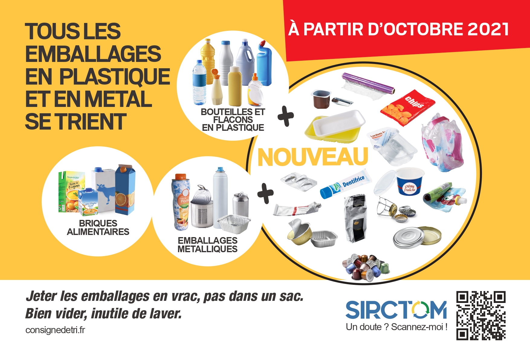 Vous pouviez déjà mettre vos bouteilles, bidons et flacons en plastique dans le bac jaune, de même que les canettes, boites de conserve, aérosols non dangereux et briques alimentaires. Pas de changement de ce côté-là. Vous pourrez cependant ajouter dans ce bac de tri, dès le mois d’octobre prochain :