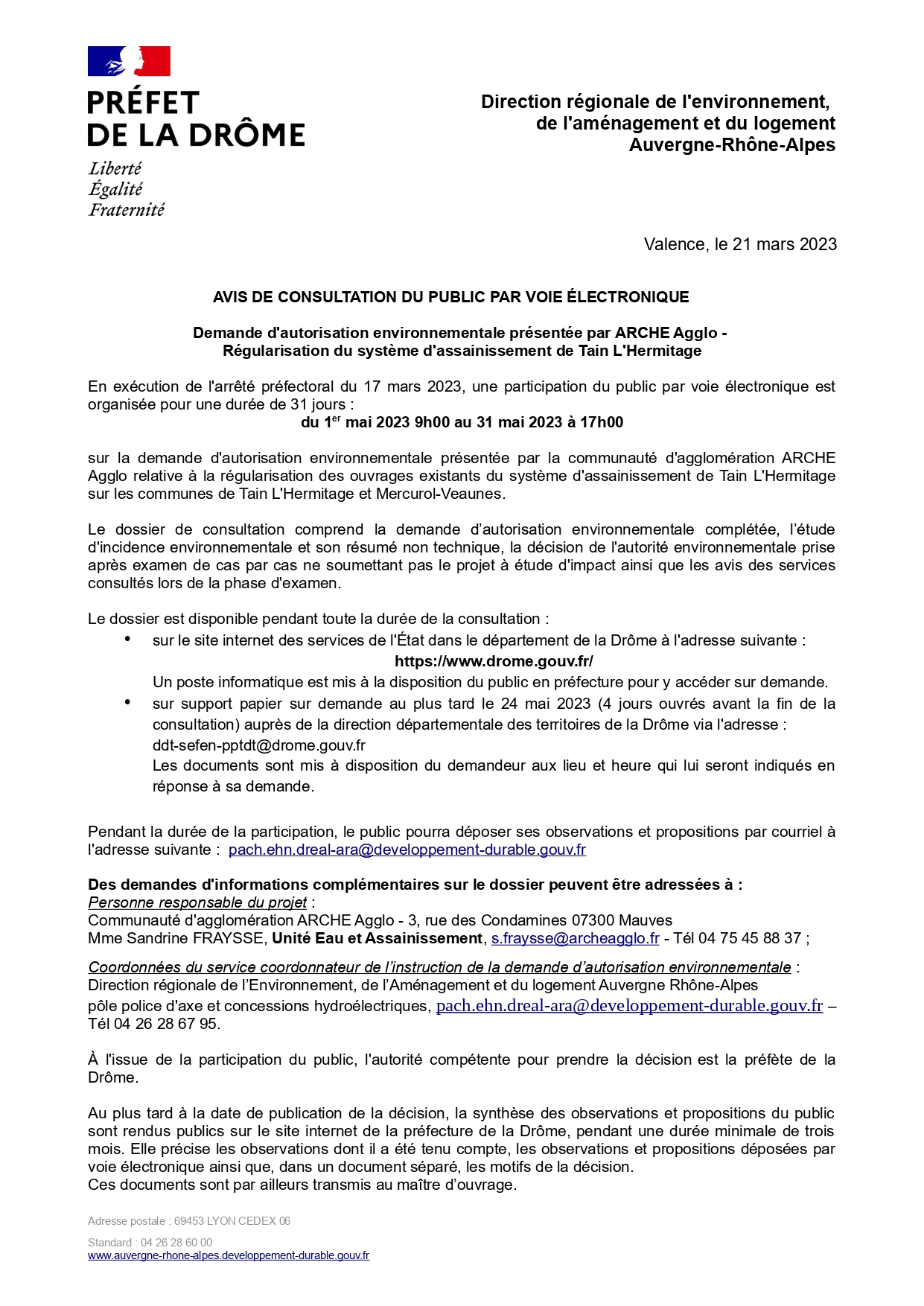 sur la demande d’autorisation environnementale présentée par la communauté d’agglomération ARCHE Agglo relative à la régularisation des ouvrages existants du système d’assainissement de Tain L’Hermitage sur les communes de Tain L’Hermitage et Mercurol-Veaunes.