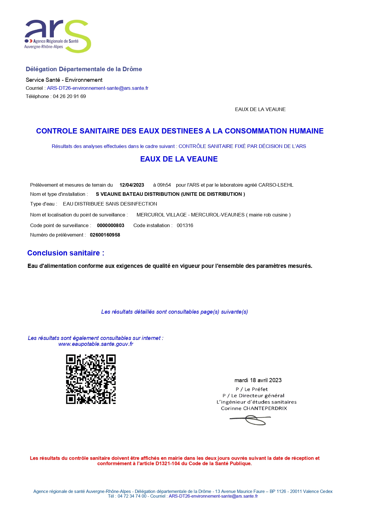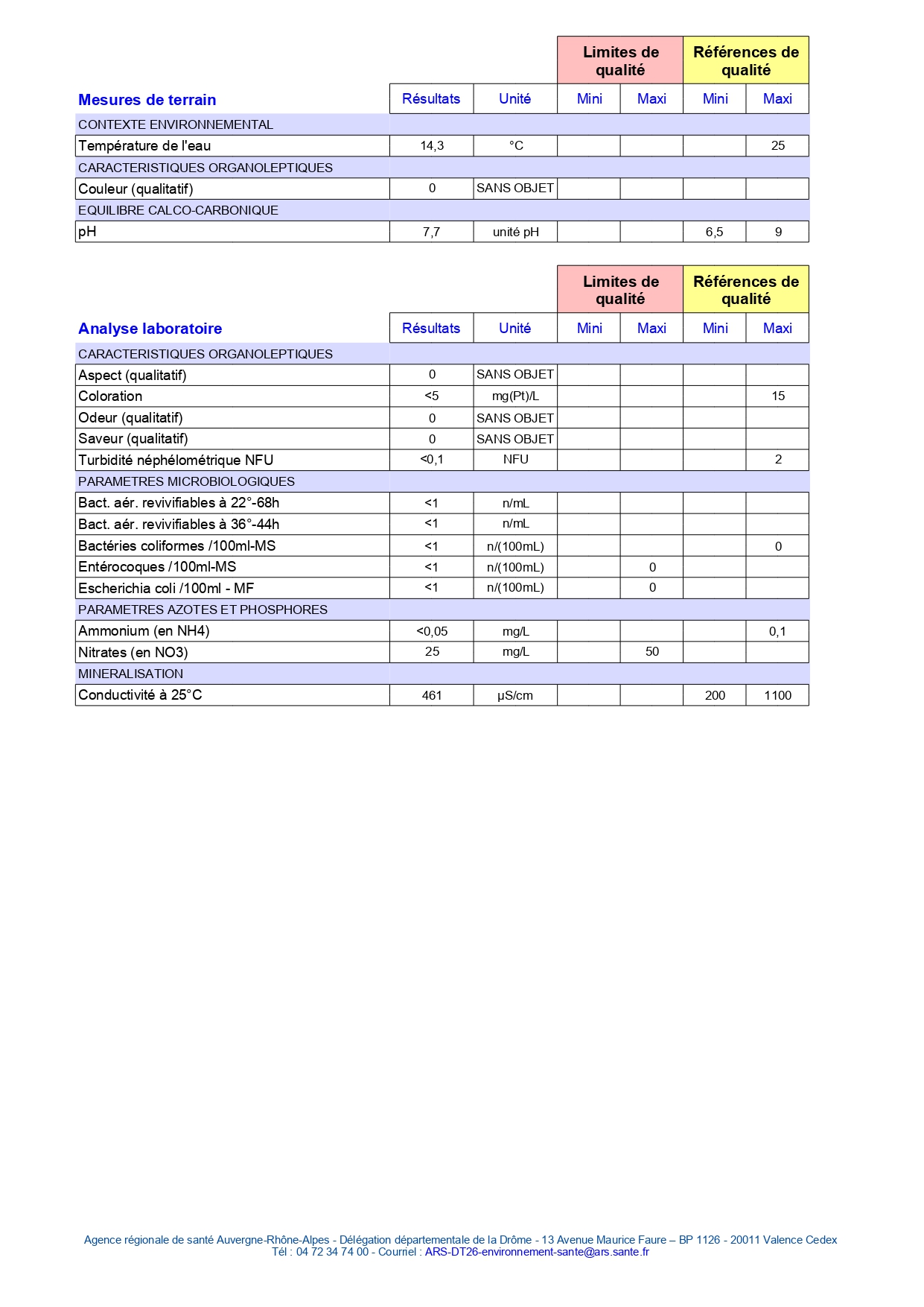 Ci-dessous le rapport de la dernière analyse d’eau destinée à la consommation humaine.