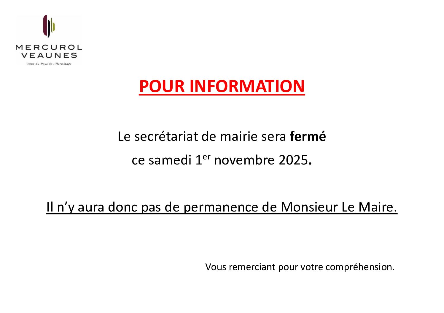 Le secrétariat de mairie sera fermé ce samedi 1ᵉʳ novembre 2025.